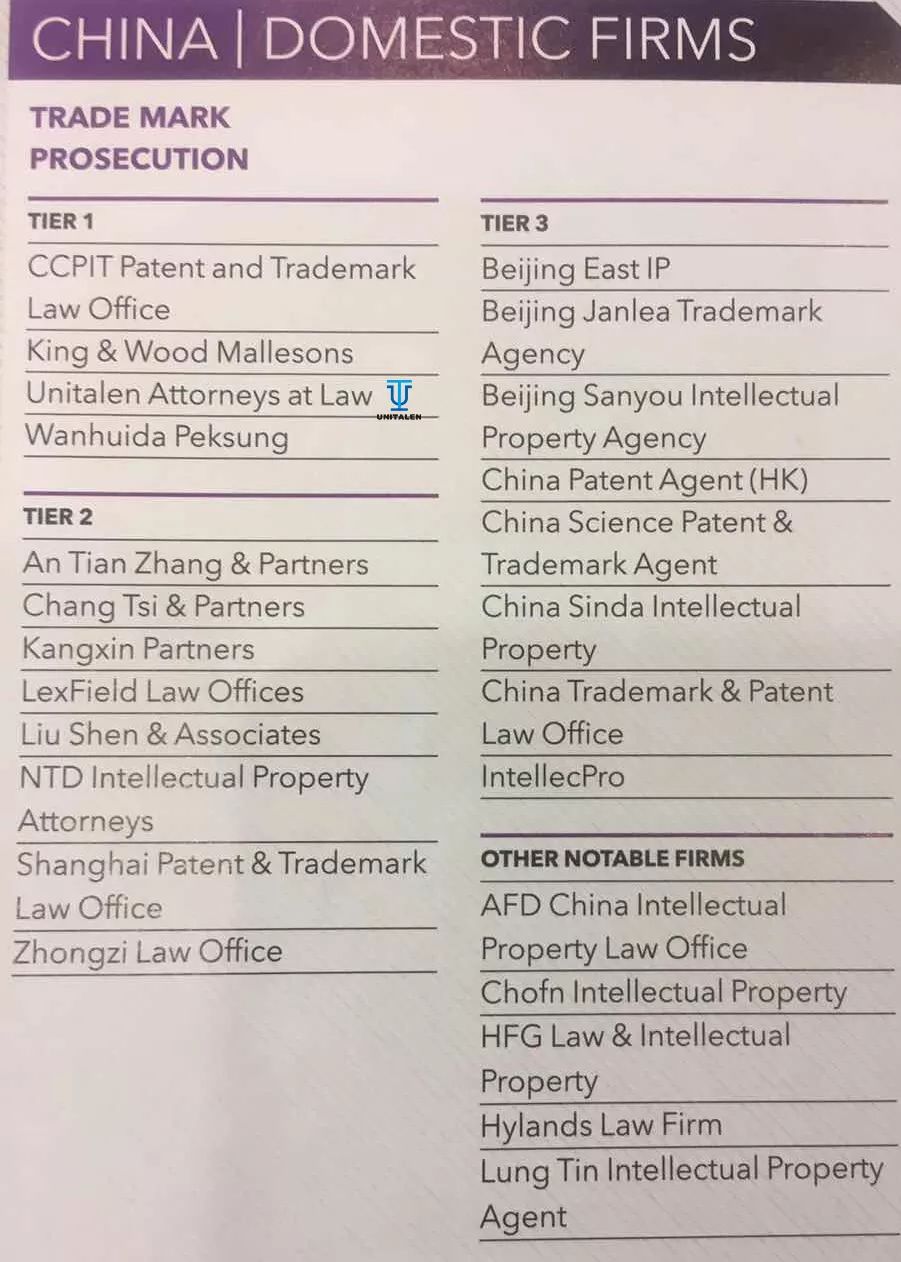 | Recently, the internationally acclaimed IP media "Managing Intellectual Property" (MIP) announced the "2019 IP Star Trademark Business Ranking", Unitalen, once again, found among the Tier 1 in China in the field of trademark application and trademark litigation.