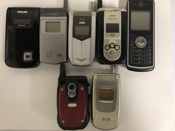 (請(qǐng)求者が使用公開の証拠としようとして提出した舊型攜帯電話7機(jī)種。左から右、上から下へ順に、フィリップス9@9r、夏新A8、波導(dǎo)V08、夏新M66、モトローラW161、パナソニックX77、サムスンSGH-S508)