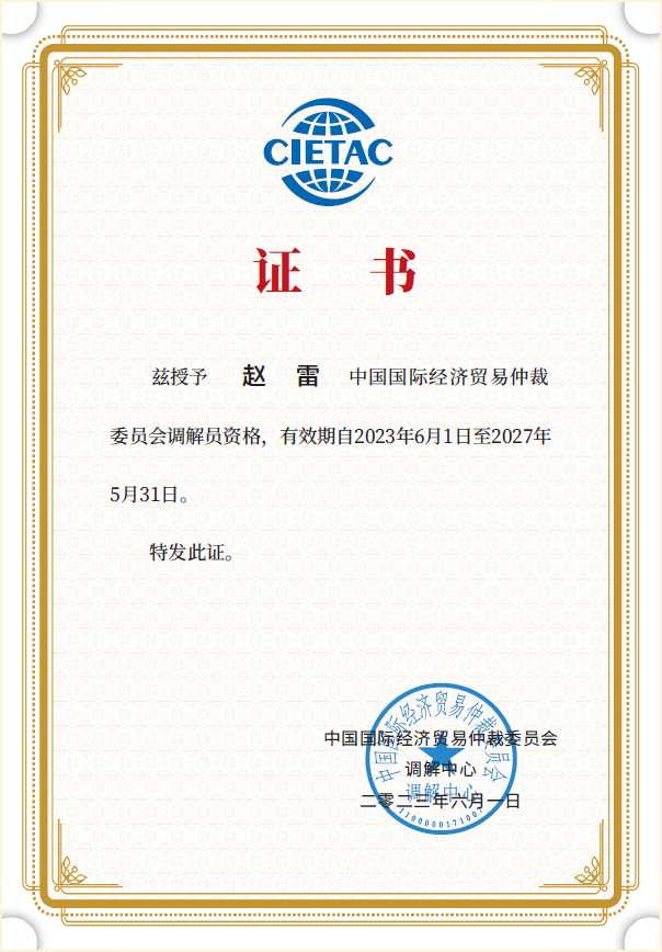 集佳高級合伙人趙雷律師獲聘為中國國際經(jīng)濟貿(mào)易仲裁委員會調(diào)解員