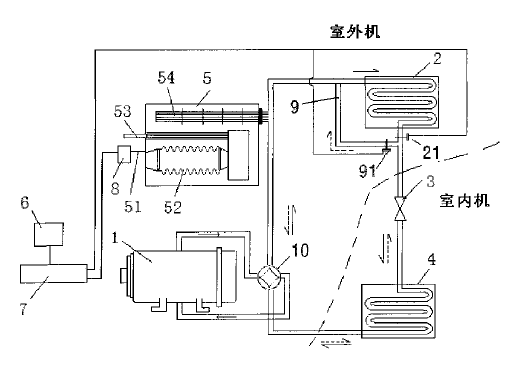 本發(fā)明公開了一種制冷、制熱的雙能源燃氣熱泵空調系統(tǒng)及運行方法,包括熱泵系統(tǒng),還包括一真空鍋爐換熱裝置、一溫度傳感器、以及一切換電路;真空鍋爐換熱裝置設置在室外,通過管道連接在熱泵系統(tǒng)的壓縮機和第一熱交換器之間,與其他部件處于同一循環(huán)系統(tǒng)中;溫度傳感器設置在室外,該溫度傳感器的輸出端與切換電路的輸入端電連接;切換電路根據溫度傳感器輸出的溫度信號控制真空鍋爐換熱裝置和第一熱交換器的交替啟閉。當室外溫度降到設定溫度以下時,真空鍋爐裝置制熱,從而徹底解決了普通熱泵系統(tǒng)在冬天低氣溫的時候室外機從空氣中吸熱效率低下、以及結霜導致系統(tǒng)無法運行的問題。具有效率高、制熱效果好和降低用電高峰時電力系統(tǒng)的壓力的優(yōu)點。 |