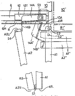 | 25 | 實用新型 | 門的開關機構 | 本發(fā)明提供可以把折疊式門打開大于90度角的門的開關機構。柜體(10)形成的開門部位至少有要開關一部分的相鄰的兩扇門A1、A2,以上下方向的第1軸S1為中心連結在一起,并可以相互轉動,一扇門A1具有以遠離上述第1軸一側A1R附近上下方向的第2軸S2為中心與柜體連結,并能相對柜體轉動的折疊式門A,以及沿柜體開口部位左右方向移動的移動件12,以上下方向的第3軸S3為中心與上述移動件連結,并能相對上述移動件轉動的轉動部件14A、14B。上述折疊式門的另一扇門A2以在遠離上述第1軸一側A2L附近的第4軸S4為中心,連結上述轉動部件,并可以相互轉動。 |