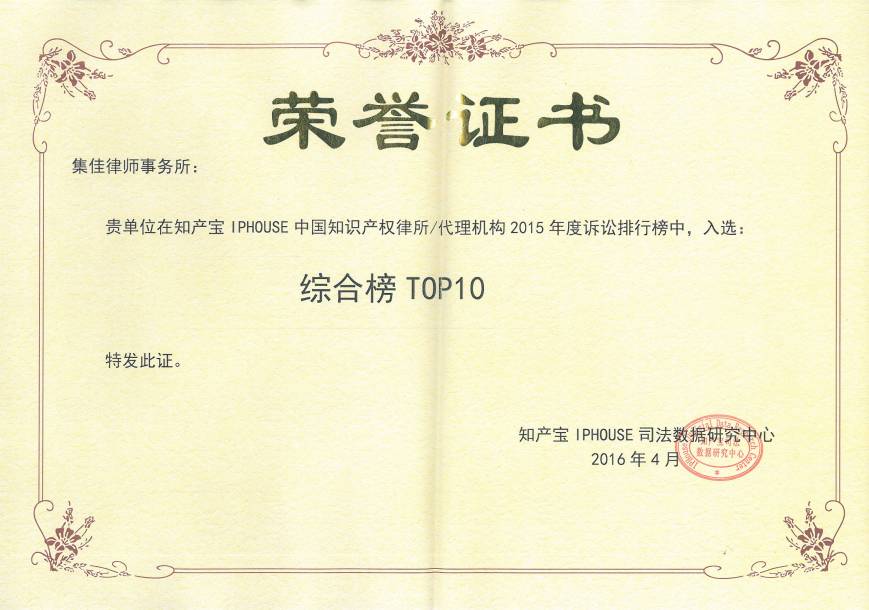 2016年5月11日下午, 知產(chǎn)寶司法數(shù)據(jù)研究座談會暨知產(chǎn)寶中國知識產(chǎn)權律所訴訟排行榜優(yōu)秀律所頒獎儀式在京舉行,集佳律所憑借自身的專業(yè)實力和卓越的影響力入選行政榜TOP10和綜合榜TOP10。各級司法機關代表、相關國家駐華使館人員及優(yōu)秀的律所、代理公司代表等五十余人參加了此次頒獎儀式。