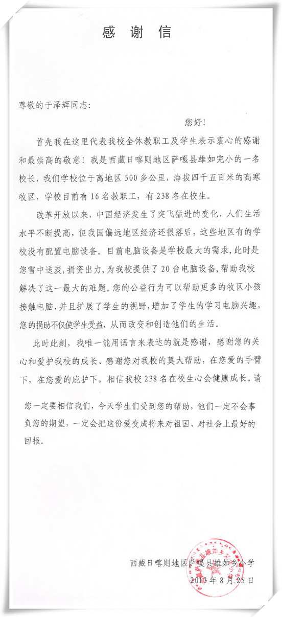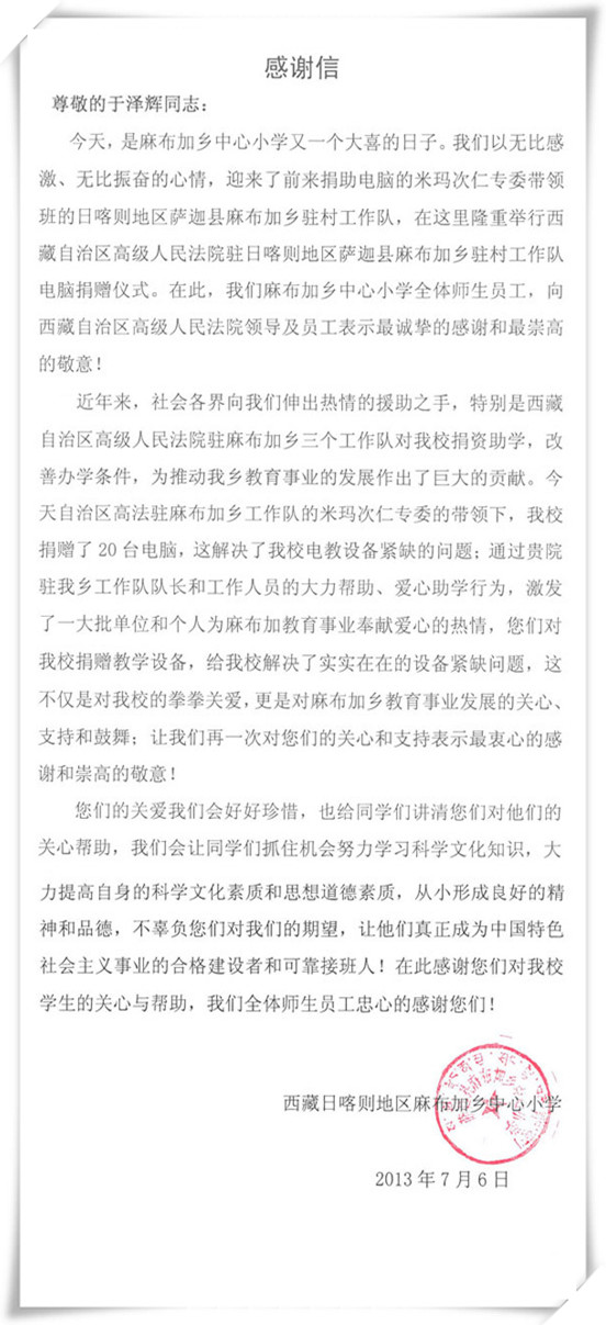2013年春節(jié)前后,集佳先后精心準(zhǔn)備了多批電腦,為藏區(qū)的孩子們送去了一份份溫暖的春節(jié)禮物。近日,集佳陸續(xù)收到薩迦縣麻布加鄉(xiāng)小學(xué)和日喀則地區(qū)薩嘎縣雄如鄉(xiāng)小學(xué)的感謝信,感謝集佳捐贈(zèng)電腦,為學(xué)校解決了難題,也為孩子們了解大千世界開啟了一扇門!