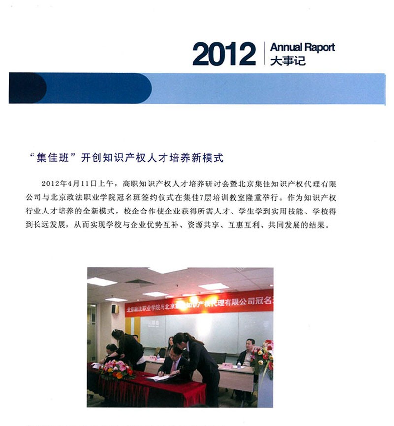 集佳于2012年4月11日上午在北京總部舉行高職知識(shí)產(chǎn)權(quán)人才培養(yǎng)研討會(huì)暨北京集佳知識(shí)產(chǎn)權(quán)代理有限公司與北京政法職業(yè)學(xué)院冠名班簽約儀式。本次簽約儀式標(biāo)志著企業(yè)與院校間建立合作、定向培養(yǎng)專(zhuān)業(yè)人才的方式開(kāi)啟,解決了學(xué)校教育與社會(huì)需求脫節(jié)的問(wèn)題。集佳與北京政法職業(yè)學(xué)院的這次校企合作能夠圓滿(mǎn)成功,為全國(guó)提供了知識(shí)產(chǎn)權(quán)人才定向培養(yǎng)的成功經(jīng)驗(yàn)。