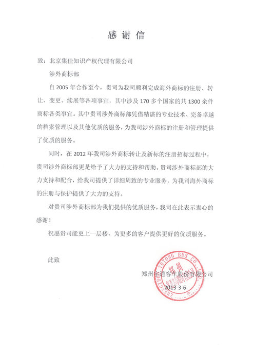 3月6日,鄭州宇通客車股份有限公司向集佳發(fā)來感謝信。合作的8年來,集佳為宇通涉外商標(biāo)注冊、轉(zhuǎn)讓、變更、續(xù)展等提供了優(yōu)質(zhì)服務(wù),宇通在集佳的幫助和支持下成功完成了2012年涉外商標(biāo)轉(zhuǎn)讓及新標(biāo)注冊的招投標(biāo)項目。