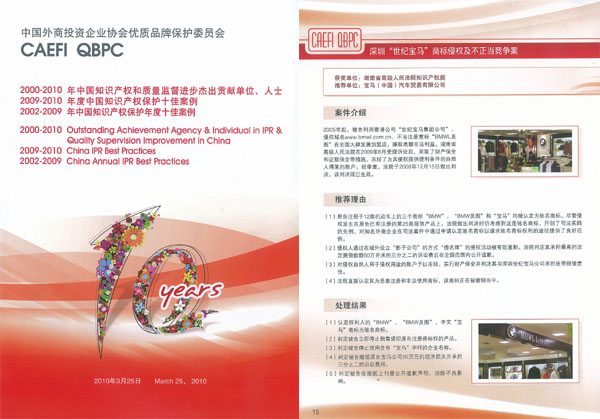 2010年3月25日,在隆重的中國(guó)外商投資企業(yè)協(xié)會(huì)優(yōu)質(zhì)品牌保護(hù)委員會(huì)成立十周年慶典上,由集佳代理的寶馬股份公司訴深圳市世紀(jì)寶馬服飾有限公司(以下簡(jiǎn)稱“世紀(jì)寶馬”)等商標(biāo)侵權(quán)及不正當(dāng)競(jìng)爭(zhēng)一案榮登品保委2009-2010年度中國(guó)知識(shí)產(chǎn)權(quán)保護(hù)十佳案例。