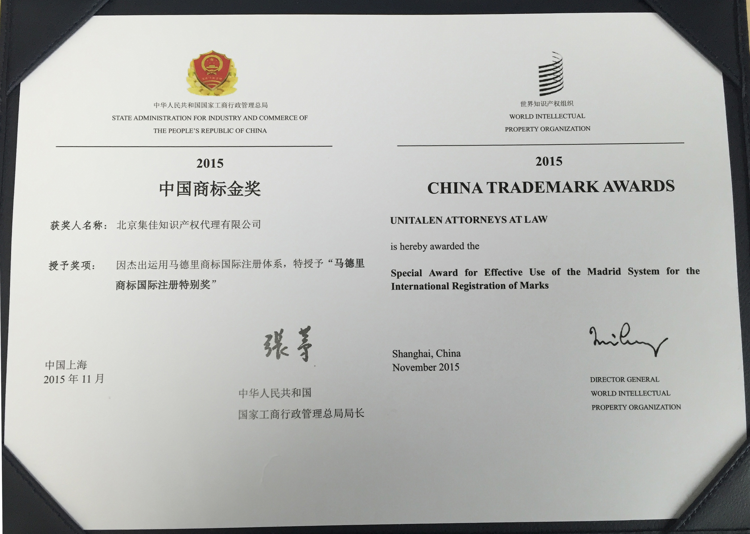 于澤輝所長代表公司參加了此次表彰大會。因杰出運用馬德里商標(biāo)國際注冊體系,國家工商總局和世界知識產(chǎn)權(quán)組織特授予集佳“馬德里商標(biāo)國際注冊特別獎”。據(jù)悉,集佳是國內(nèi)唯一一個代理機構(gòu)榮獲此獎項。