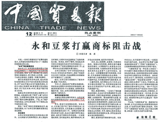 《中國貿易報》:永和豆?jié){打贏商標阻擊戰(zhàn)