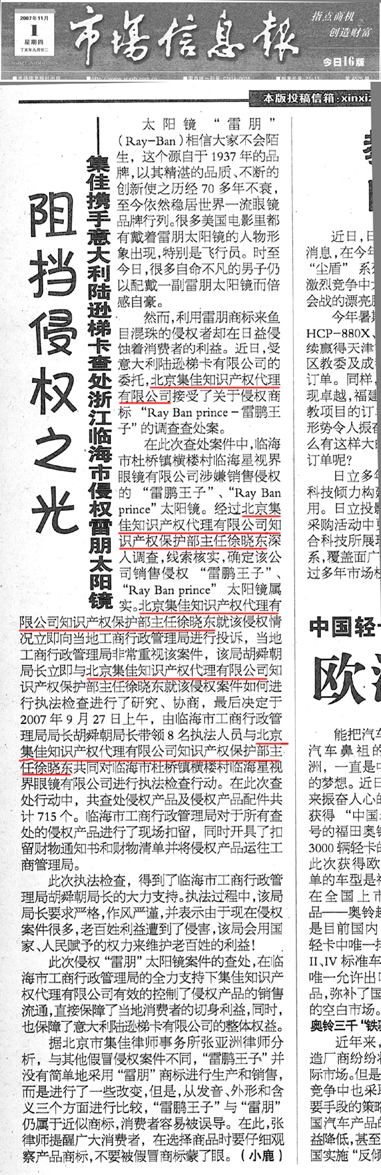 《市場信息報》:阻侵權(quán)之光——雷朋太陽鏡打假維權(quán)