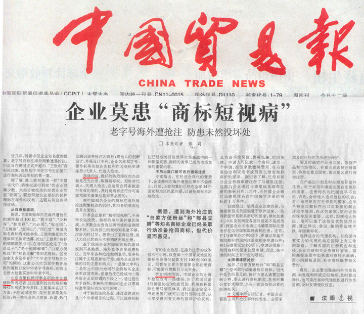 《中國貿(mào)易報(bào)》采訪:《企業(yè)莫患“商標(biāo)短視病” 老字號(hào)海外遭搶注 防患未然沒壞處》