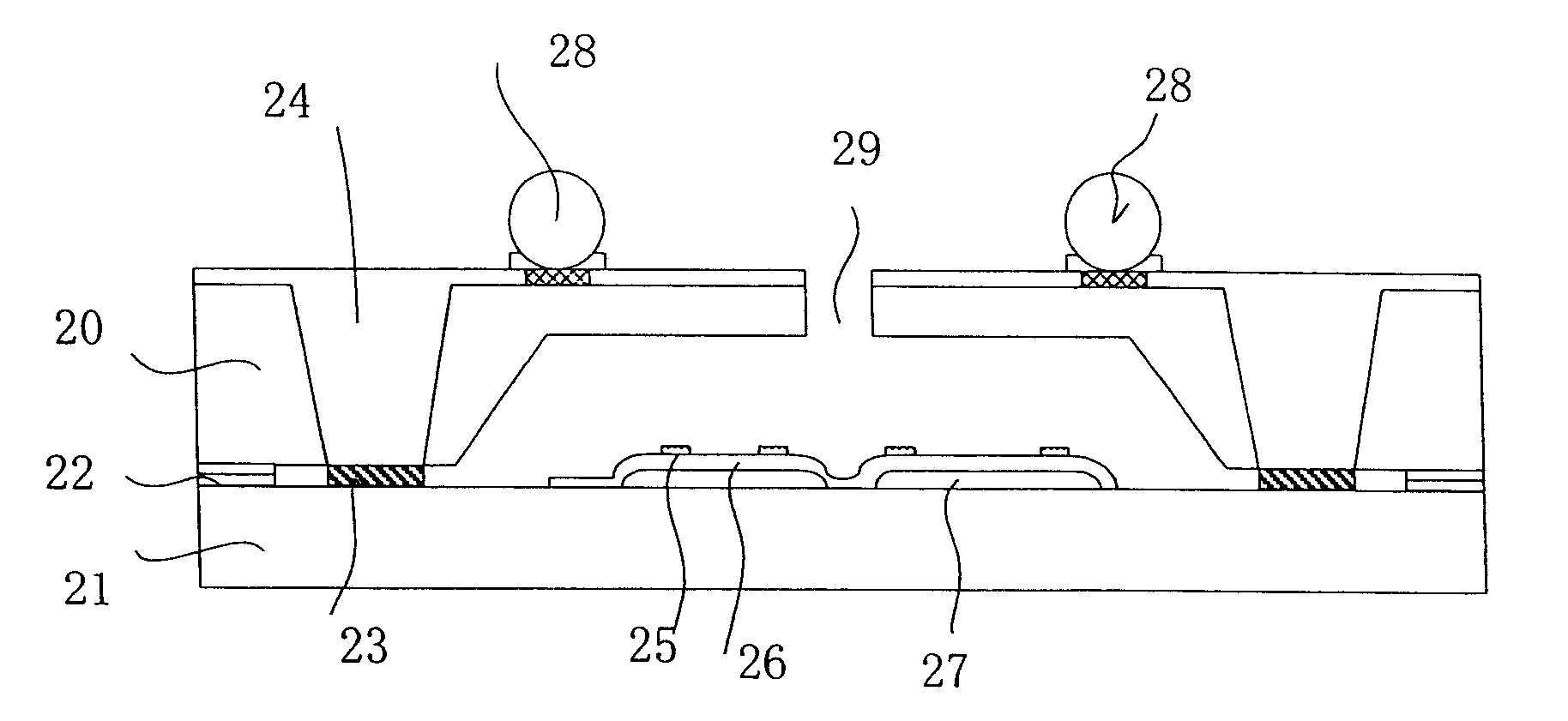 而根據(jù)對比文件1圖2(下圖I)可以看出,金屬層24直接裸露與整個芯片外部,其與焊接凸點(diǎn)28電連接,并不位于某種介質(zhì)之間;并且由于對比文件1中也沒有公開信號處理電路,因此,金屬層24也必然不位于信號處理電路的上方。因此,對比文件1中的金屬層24與本申請第二襯底的導(dǎo)體連線層的位置不同,其次,對比文件1中金屬層24的作用是用于將壓力傳感器的信號向MEMS的外部傳送,而不是用于將壓力傳感器的信號傳送至MEMS內(nèi)部某一襯底中的信號處理電路。所以,兩者的作用也不同,因此,對比文件1中的金屬層24不相當(dāng)于本申請權(quán)利要求1中導(dǎo)體連線層。