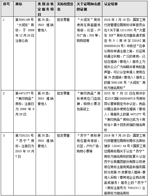 另外,即使在商標授權(quán)確權(quán)程序中,對一些案件的裁判結(jié)果與固有的“批發(fā)零售和推銷替他人不相同不類似”認知也相左,以下列舉“大潤發(fā)”、“無印良品”和“蘇寧”三個行政認定馳名商標案件為例予以說明?!按鬂櫚l(fā)”是知名的連鎖超市品牌,其權(quán)利人在2009年12月在第35類第3503類似群“推銷(替他人)”服務(wù)項目上注冊第5091186號“大潤發(fā)”商標,后在批發(fā)零售業(yè)態(tài)上進行了大量使用,2015年基于在批發(fā)零售上使用形成的知名度,第5091186號“大潤發(fā)”商標被認定為上海市著名商標,2016年該商標被原國家工商總局商評委認定為馳名商標。除此之外,類似情形的還有無印良品和蘇寧兩案。