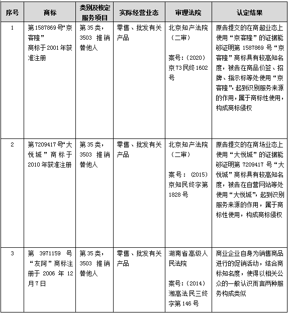 但對于熟悉商標授權(quán)確權(quán)程序和商標民事侵權(quán)訴訟的代理人而言,一個耐人尋味的現(xiàn)象是2011年至今全國各地法院審理的商標民事侵權(quán)訴訟認定結(jié)果卻與上述系列商標行政訴訟認定結(jié)果大相徑庭,例如:四川高院2011年和廣東高院2014年判決的好又多案【16】,北京知識產(chǎn)權(quán)法院2015年和2020年判決的大悅城和京客隆案【17】,湖南高院判決的友阿案【18】,山東高院判決的谷子案【19】等均無一例外認為批發(fā)零售與推銷替他人構(gòu)成類似服務(wù)。對于這種商標民事侵權(quán)與商標授權(quán)確權(quán)兩程序中出現(xiàn)的差異,作為審理商標授權(quán)確權(quán)行政訴訟的二審法院,北京高院知識產(chǎn)權(quán)庭在2017年《商標授權(quán)確權(quán)行政案件相關(guān)疑難問題的調(diào)研報告(三)》【20】一文中給予了回應(yīng),其認為應(yīng)當區(qū)分在商標民事糾紛中對商標專用權(quán)的保護和在商標權(quán)撤銷復審行政糾紛中對商標專用權(quán)維持有效制度的差異,在商標民事侵權(quán)案件中,對商標專用權(quán)的保護體現(xiàn)為“禁用權(quán)”所限定的范圍,其是以法律所規(guī)定的侵害他人注冊商標專用權(quán)為基礎(chǔ),以是否會造成商品的來源混淆為落腳點,而發(fā)生混淆的范圍不僅及于注冊商標所核定使用的相同商品或服務(wù),也包括了類似商品或服務(wù),而對類似商品或服務(wù)的判斷,是從功能、用途、生產(chǎn)部門、銷售渠道、消費群體、服務(wù)對象、內(nèi)容、方式等方面進行的認知。故商標禁用權(quán)的范圍顯然超過了專用權(quán)。