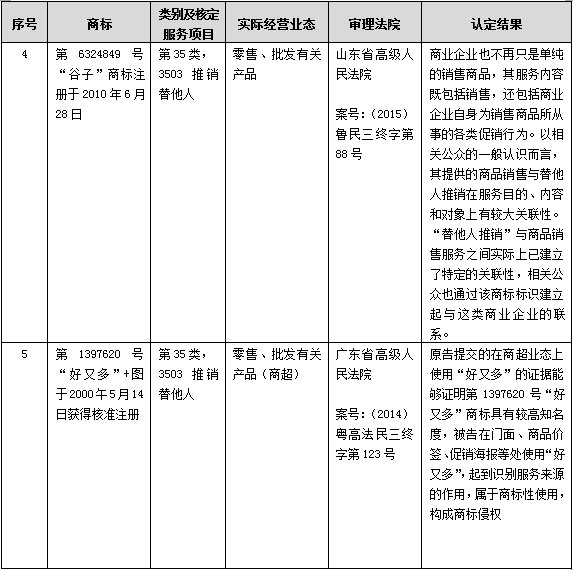 坦白地講,由于我國商標注冊主管機關(guān)并未準予在批發(fā)零售服務(wù)上注冊商標,因此司法機關(guān)當然也不能越俎代庖。但根據(jù)“大悅城”、“好又多”、“京客隆”等商標侵權(quán)案件在司法實踐中確立的規(guī)則可知,在遵守目前區(qū)分表的既有規(guī)定以及尊重商標授權(quán)確權(quán)行政主管機關(guān)獨立行使審查權(quán)的情況下,可行的解決方案是,考慮到批發(fā)零售與推銷替他人之間客觀上存在密切的關(guān)聯(lián)關(guān)系,故,基于注冊商標禁用權(quán)保護的需要,將批發(fā)零售與推銷替他人認定為類似服務(wù),從而為那些在第35類推銷替他人服務(wù)上已注冊的知名度高、顯著性強的商標提供對等保護。以下是選取的基于“推銷替他人”保護批發(fā)零售及的案例: