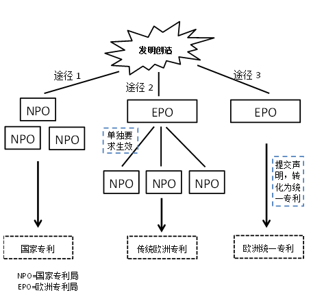 為了簡化專利申請的流程和統(tǒng)一專利審批的標準,歐洲各國簽訂了歐洲專利公約(EPC)并建立了歐洲專利局(EPO)。申請人可以直接向EPO遞交專利申請,在EPO授權后分別在感興趣的國家生效其專利。下文中我們稱這種類型的專利為“傳統(tǒng)歐洲專利”。此種申請途徑我們稱之為途徑2。