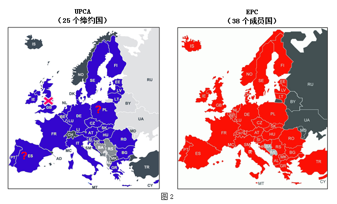 值得注意的是,英國盡管在2018年4月批準了該協(xié)議,但是由于脫歐,目前英國已退出UPCA。另外,有些歐洲國家如瑞士、挪威、冰島等并非歐盟成員國,所以也沒有加入UPCA。而典型地,歐洲專利公約EPC的成員國如土耳其也不能加入UPCA。下面的圖二對比了EPC成員國和預期UPCA締約國的覆蓋范圍。其中,在UPCA的地圖中,灰色顯示的國家是非歐盟成員國同時也不能加入UPCA,叉號表示的英國已經(jīng)脫歐且退出UPCA,問號表示的西班牙和波蘭目前沒有意愿加入UPCA,但是隨時可能加入。