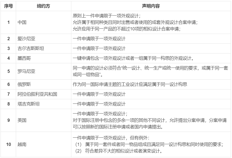 通過海牙體系提交國際注冊申請,一件申請中最多可以包含不超過100項外觀設(shè)計,前提是這些外觀設(shè)計同屬于同一大類(洛迦諾分類)。不過,并不是所有締約方的法律都放開了合案申請的外觀設(shè)計的限制。如果根據(jù)其國內(nèi)法律規(guī)定,不允許就不同外觀設(shè)計進行合案或者對合案數(shù)量有所限制,則該締約方必須提前向國際局提出聲明,下列為目前作出聲明的締約方及其聲明的內(nèi)容: