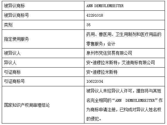 國家知識產(chǎn)權(quán)局經(jīng)審理本案認(rèn)為:被異議商標(biāo)“ANN DEMEULEMEESTER”指定使用于第35類“藥用、獸醫(yī)用、衛(wèi)生用制劑和醫(yī)療用品的零售服務(wù);會計”等服務(wù)上。異議人引證在先注冊的第10622034號“安?迪穆拉米斯特”等系列商標(biāo)核定使用于第35類“商業(yè)場所搬遷;文秘;會計”等服務(wù)上。雖然雙方商標(biāo)指定使用的部分服務(wù)相近,屬于類似服務(wù),但雙方商標(biāo)文字構(gòu)成及整體外觀具有一定區(qū)別,未構(gòu)成近似商標(biāo),因此雙方商標(biāo)未構(gòu)成使用于類似服務(wù)上的近似商標(biāo)。本案中,異議人稱被異議人侵犯其姓名權(quán)并提供了如下證據(jù):異議人ANN DEMEULEMEESTER為世界知名時尚設(shè)計師,曾多次參加米蘭時裝周、巴黎時裝周等時尚頂級活動,同時異議人創(chuàng)辦的同名品牌“ANN DEMEULEMEESTER”在倫敦、巴黎、東京、香港、上海等地均有其專賣店,并在相關(guān)公眾中獲得了一定的影響力。上述證據(jù)可證明:異議人ANN DEMEULEMEESTER在時尚行業(yè)內(nèi)已具有一定知名度,為相關(guān)公眾所知曉。此外,ANN DEMEULEMEESTER獨創(chuàng)性極高,并非常見的外國姓名,且被異議商標(biāo)“ANN DEMEULEMEESTER”是普通字體的純英文商標(biāo),與異議人姓名在字母組成及呼叫上完全相同。被異議人未經(jīng)異議人許可,擅自將與其姓名完全相同的“ANN DEMEULEMEESTER”作為商標(biāo)申請注冊,已構(gòu)成對異議人姓名權(quán)的侵犯。