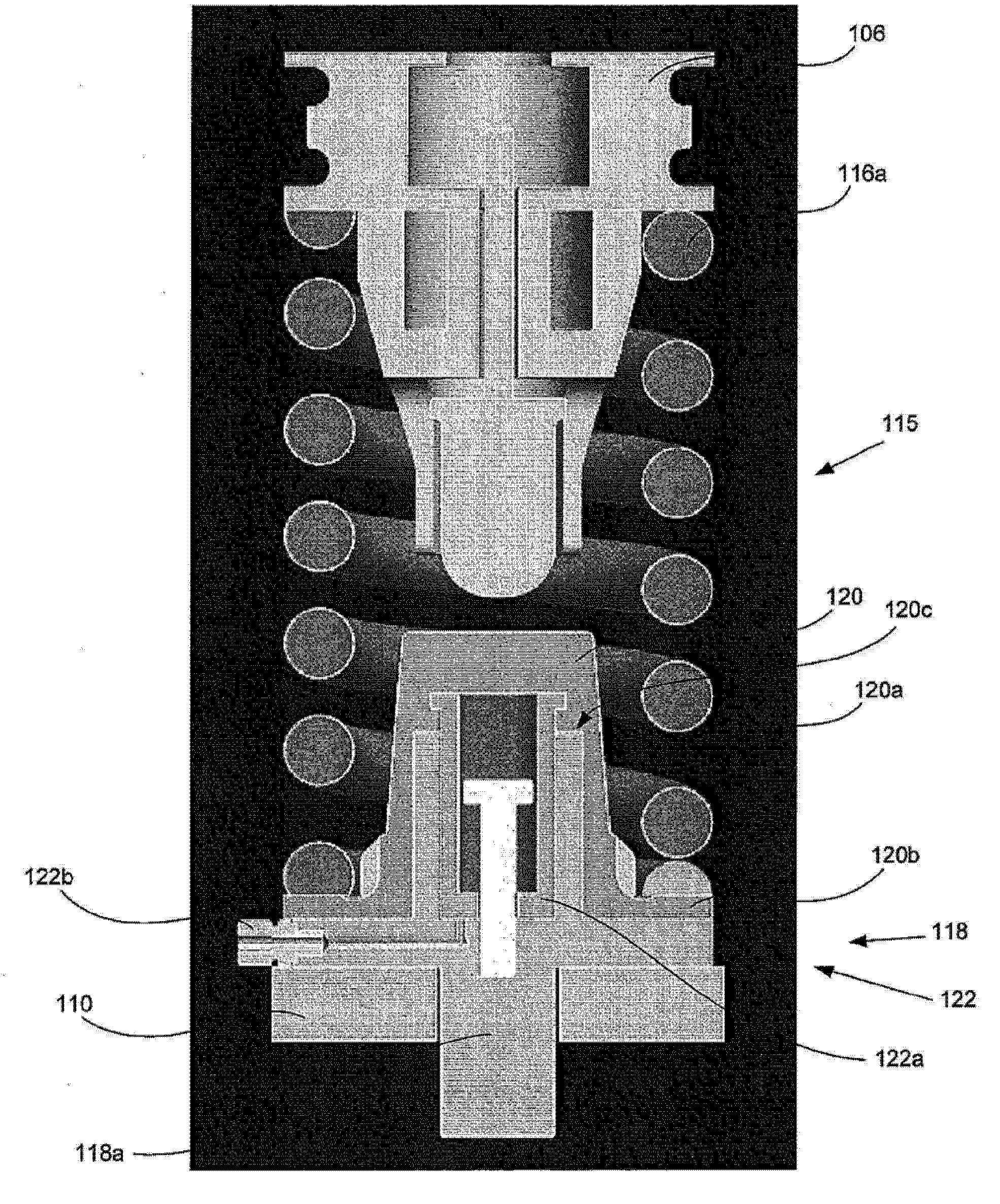 對(duì)比文件1公開(kāi)了一種調(diào)平懸掛115,其包括與SML118接合的彈簧116a,其中彈簧116a的上表面與上部結(jié)構(gòu)106(對(duì)應(yīng)于本申請(qǐng)中的廂體)接合,而SMLS的下端118a與轉(zhuǎn)向架110接合。此外,SMLS118包括彈簧支架(SM)120和活塞組件122。SM 120包括定位在螺旋彈簧116a內(nèi)的空心缸筒120a。