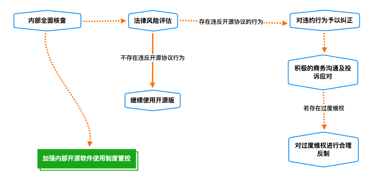 企業(yè)法務(wù)部門與技術(shù)部門應(yīng)盡快協(xié)同進行內(nèi)部核查,排查公司對Qt開源軟件的使用情況、對應(yīng)的開源協(xié)議、是否遵循了開源義務(wù)、是否購買過商業(yè)授權(quán)、軟件使用量等。如果無法確定涉及的開源軟件及相應(yīng)的開源義務(wù)遵守情況,建議找專業(yè)外部律師團隊進行咨詢。如果確實存在違約行為,則盡快予以糾正。