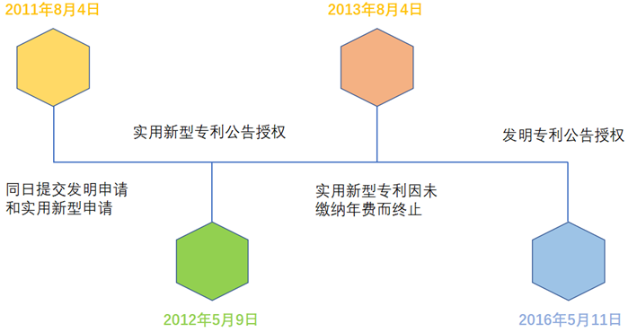 為了使得本案的時(shí)間脈絡(luò)一目了然,筆者根據(jù)涉案發(fā)明專(zhuān)利和與其同日提交的實(shí)用新型專(zhuān)利的重要時(shí)間節(jié)點(diǎn)繪制了以下時(shí)間軸: