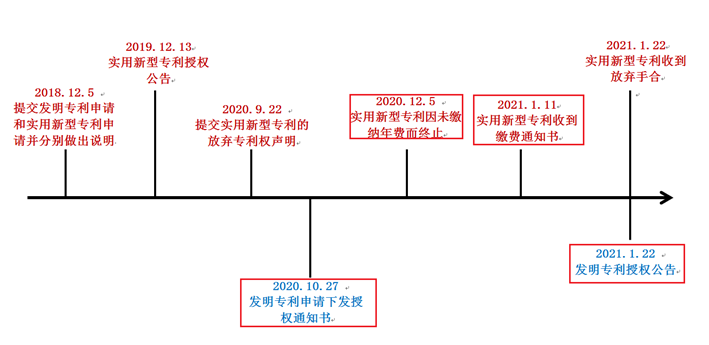 在實(shí)踐中,最常見(jiàn)的誤區(qū)之一就是:已收到了發(fā)明專(zhuān)利的授權(quán)通知書(shū)并且先前已針對(duì)實(shí)用新型專(zhuān)利提交了放棄聲明,因此無(wú)需再維持實(shí)用新型。下圖給出了一個(gè)非常典型的此類(lèi)誤區(qū)的案例。