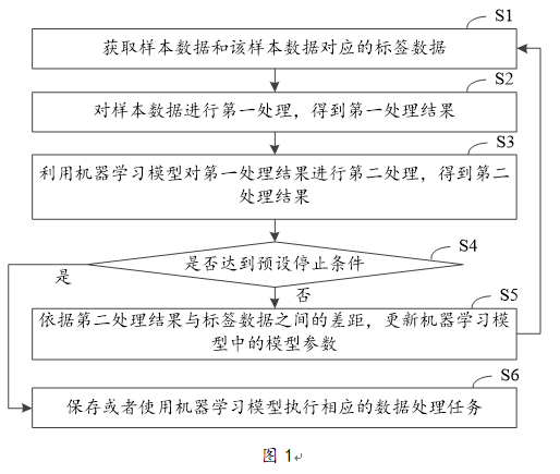 步驟4,判斷是否達到預設停止條件,若否,則依據(jù)所述第二處理結果和所述標簽數(shù)據(jù)之間的差距,更新機器學習模型中的模型參數(shù),并繼續(xù)執(zhí)行所述步驟1至所述步驟4;若是,則保存或者使用所述機器學習模型執(zhí)行相應的數(shù)據(jù)處理任務。