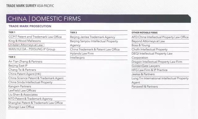 日前,全球權(quán)威知識產(chǎn)權(quán)雜志Managing Intellectual Property (MIP)公布“2017知識產(chǎn)權(quán)之星” 商標業(yè)務(wù)排行榜,集佳在“商標申請”和“商標訴訟”領(lǐng)域穩(wěn)居中國區(qū)第一梯隊(Tier 1)。
