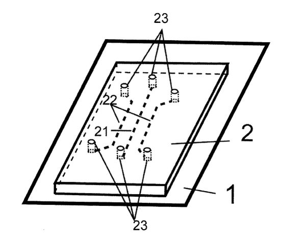 所述基底上表面上附著的蛋白條帶與所述聚二甲基硅氧烷印章的直線型中間凹槽和直線型側(cè)凹槽相交不重合。其裝置附圖如下(圖中21、22虛線即為凹槽,蛋白條帶未在圖中標(biāo)出,可直接理解為與21、22虛線垂直相交):