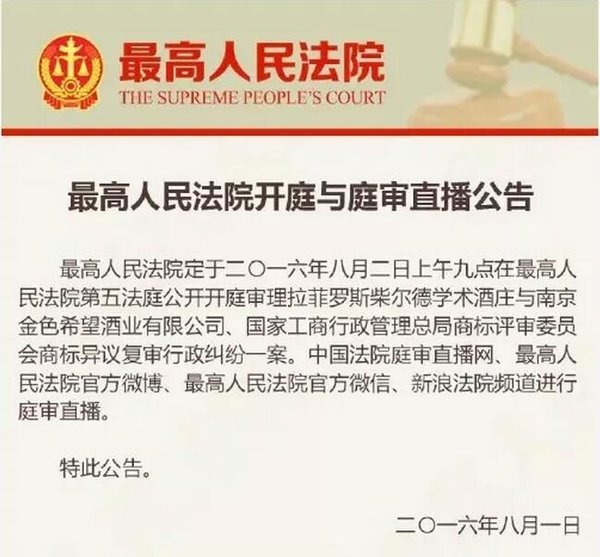 2016年8月1日最高法院通過其官方微博發(fā)布公告,公布了2016年8月2日將對“拉菲莊園”案開庭與庭審直播的消息。8月2日當日,庭審通過中國法院庭審直播網(wǎng)、最高法院官方微博、最高法院官方微信、新浪法院頻道進行了全程直播,庭審持續(xù)了5個多小時。