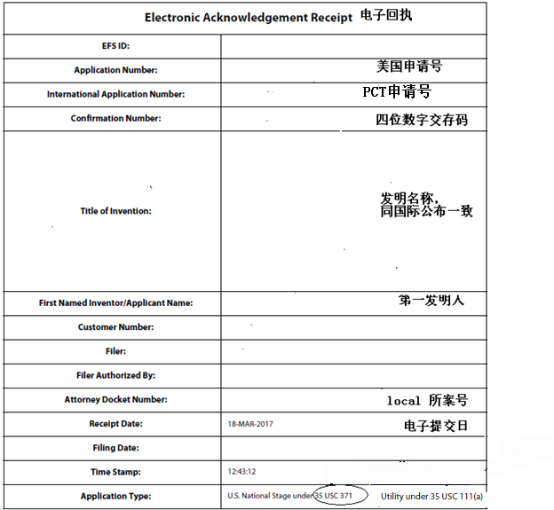 應(yīng)核查電子回執(zhí)中的基本信息,并通過(guò)核查電子回執(zhí)中的信息來(lái)判斷申請(qǐng)類(lèi)型是否正確。以下是對(duì)電子回執(zhí)的摘錄說(shuō)明,供參考。從該摘錄說(shuō)明中可看出,當(dāng)Application Type顯示為 U.S.National stage under 35 U.S.C. 371時(shí),則說(shuō)明該美國(guó)申請(qǐng)是PCT進(jìn)入美國(guó)國(guó)家階段的申請(qǐng);當(dāng)Application Type顯示為 Utility under 35 U.S.C. 111(a)時(shí),則說(shuō)明該美國(guó)申請(qǐng)是PCT進(jìn)入美國(guó)國(guó)家的申請(qǐng)(就整體而言,也可能是巴黎公約申請(qǐng),但本節(jié)主要針對(duì)PCT進(jìn)入美國(guó)介紹)。