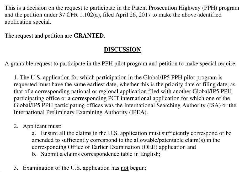 專(zhuān)利審查高速公路(簡(jiǎn)稱(chēng)PPH)是在美國(guó)專(zhuān)利申請(qǐng)中常用的加快審查途徑。USPTO是在后申請(qǐng)的審查局,且作為在先申請(qǐng)的審查局經(jīng)過(guò)審查程序認(rèn)為受理的對(duì)應(yīng)申請(qǐng)包含至少一項(xiàng)可被授權(quán)或具有可專(zhuān)利性的權(quán)利要求,那么申請(qǐng)人可以向USPTO 請(qǐng)求參與PPH 項(xiàng)目。