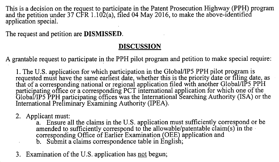 c)PPH拒絕通知(摘錄示例如下圖): 該通知是告知類(lèi)通知。告知申請(qǐng)人PPH請(qǐng)求被拒絕。 該通知通常是因PPH請(qǐng)求未滿(mǎn)足時(shí)機(jī)要求(即審查員已開(kāi)始審查)而產(chǎn)生。