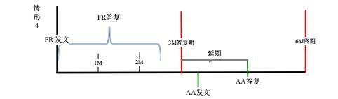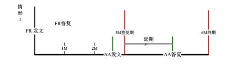 ?。?)情形1、申請(qǐng)人于FR發(fā)文日起的2個(gè)月內(nèi)完成答復(fù),審查員在3個(gè)月答復(fù)期內(nèi)發(fā)出AA,若AA答復(fù)日晚于3M法定期限,則延期自3M法定期限起算。