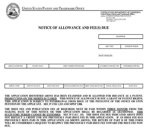 美國(guó)專(zhuān)利申請(qǐng)中,授權(quán)費(fèi)的繳納期限為3個(gè)月。該期限不能延展。