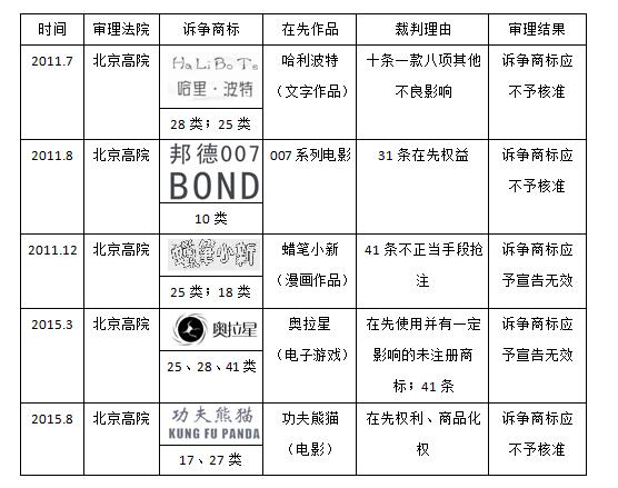 對(duì)于這種權(quán)利沖突類型,最初因缺少明確的法律規(guī)制,對(duì)在先作品名稱不予保護(hù)的情況并不少見;但隨著遏制惡意搶注的加強(qiáng),商標(biāo)禁注的“絕對(duì)條款”開始被適用,比如援引“其他不良影響”條款不予注冊(cè)的“哈里波特”,再比如援引“不正當(dāng)手段搶注”條款不予注冊(cè)的“蠟筆小新”。但用“絕對(duì)條款”保護(hù)相對(duì)權(quán)利畢竟有些名不正言不順,北京高院藉由“邦德007”、“功夫熊貓”兩案,首次將在先影視作品名稱、角色名稱作為在先權(quán)益進(jìn)行保護(hù),引導(dǎo)適用“相對(duì)條款”而不是“絕對(duì)條款”來解決這種沖突。在此期間,也有類似“奧拉星”的案件,適用“在先使用并有一定影響的未注冊(cè)商標(biāo)”條款來保護(hù)在先游戲名稱。本文附表一總結(jié)了近年來北京法院在商標(biāo)授權(quán)確權(quán)類案件中保護(hù)在先各類作品名稱的情況,供讀者參考。