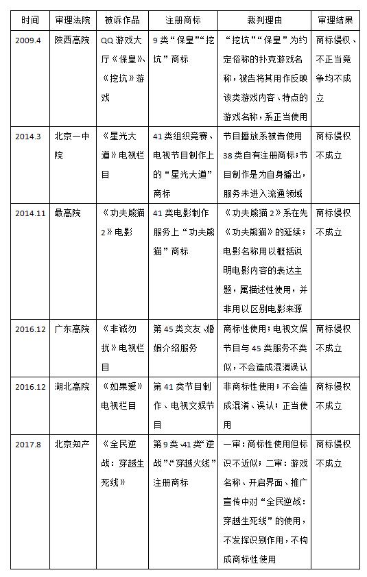 在已決案例中,一部作品的名稱——作品的類型無論是影視節(jié)目還是游戲——如果和在先注冊(cè)的商標(biāo)重合了,很少認(rèn)定商標(biāo)侵權(quán)成立的,理由大概有三種:第一,作品名稱并非商標(biāo)性使用,比如被訴侵權(quán)的《功夫熊貓》電影、《如果愛》電視欄目、《全民逆戰(zhàn)——穿越生死線》游戲;第二,作品與在先注冊(cè)商標(biāo)核定的商品或服務(wù)不類似,比如被訴侵權(quán)的《星光大道》電視欄目、《非誠勿擾》電視欄目;第三,在先注冊(cè)商標(biāo)標(biāo)識(shí),相對(duì)于作品的內(nèi)容、主題等特點(diǎn)來說具有直接的描述性,不能禁止他人正當(dāng)使用,比如被訴侵權(quán)的《挖坑》、《?;省酚螒颉I唐奉愃茊栴}和正當(dāng)使用問題,涉及到商標(biāo)標(biāo)識(shí)及作品的諸多具體細(xì)節(jié),個(gè)案性很強(qiáng);但商標(biāo)性使用問題,幾乎是所有涉及這類沖突的案件中難以繞開的爭(zhēng)議焦點(diǎn)。本文附表二,總結(jié)了各地法院對(duì)此類案件的審理情況。