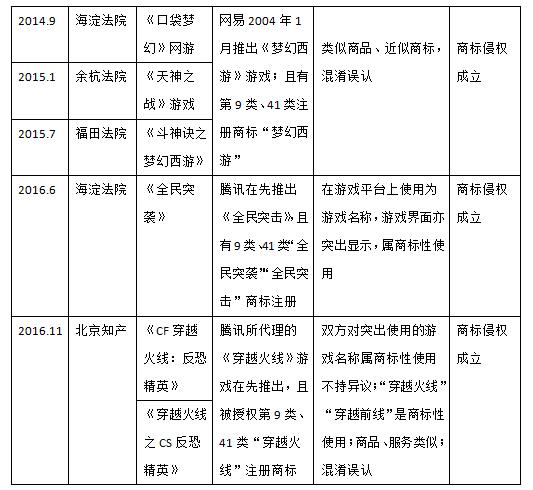 筆者也注意到,在一系列涉及游戲的商標(biāo)侵權(quán)案件中,法院大多認(rèn)定侵權(quán)成立。但這些案件也存在一個(gè)共性,即在先商標(biāo)權(quán)人同時(shí)也是在先游戲的開發(fā)者或運(yùn)營者。即便不考慮在先注冊(cè)商標(biāo),在先游戲也可以通過主張知名商品特有名稱的反法仿冒條款獲得救濟(jì)。本文附表三總結(jié)了原告具有在先作品權(quán)利人和在先商標(biāo)注冊(cè)人雙重身份的案例。