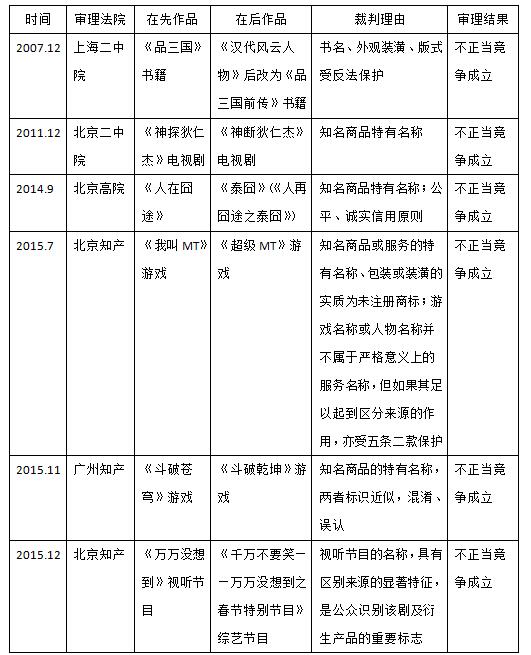 如上所述,這種沖突類型實(shí)際上是比較典型的仿冒之訴。這種沖突發(fā)生在同類作品之間,與發(fā)生在同類商品或服務(wù)之間,并沒有實(shí)質(zhì)上的區(qū)別。此類案件審理的難點(diǎn)在于,能否把原告主張的影視名稱、游戲名稱等作品名稱作為反不正當(dāng)競(jìng)爭(zhēng)法第五條第二項(xiàng)下的“知名商品的特有名稱”進(jìn)行保護(hù)。在武漢華旗訴光線傳媒、徐崢《泰囧》一案中,法院同時(shí)適用了反法第五條第二項(xiàng)和第二條公平、誠實(shí)信用原則條款,以第二條原則性條款來補(bǔ)強(qiáng)適用第五條第二項(xiàng)稍顯牽強(qiáng)的缺憾;在北京知識(shí)產(chǎn)權(quán)法院審理的《我叫MT》一案中,法院也注意到“游戲名稱或人物名稱并不屬于嚴(yán)格意義上的服務(wù)名稱”,但認(rèn)為可以將“知名商品/服務(wù)名稱”擴(kuò)大到游戲名稱、人物名稱,條件是“其足以起到區(qū)分來源的作用”。本文附表四總結(jié)了此類案件的審理情況,供讀者參考。