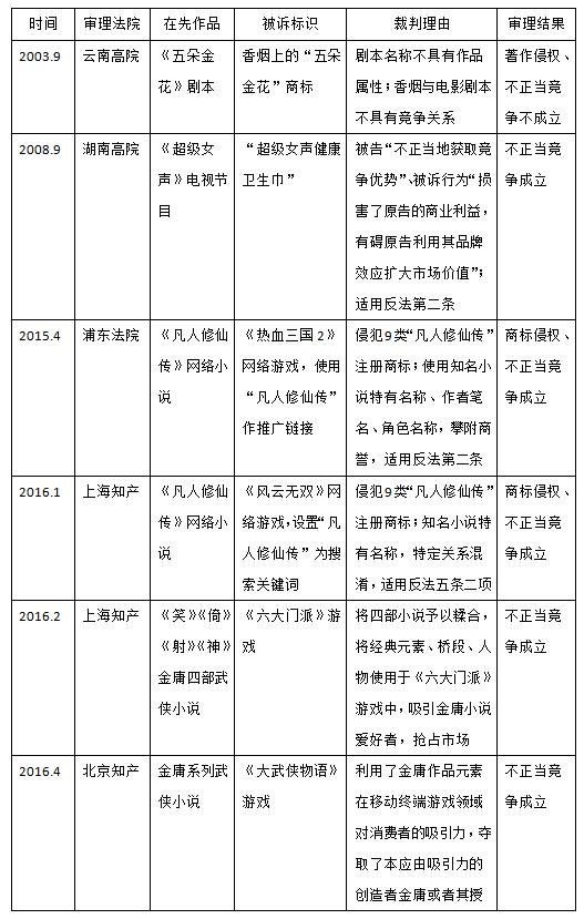 這種類型的案件目前數(shù)量不多,但可以預(yù)見,將文化轉(zhuǎn)化為商業(yè)力量已經(jīng)是文化傳媒產(chǎn)業(yè)的大趨勢(shì),隨之而來的類似案件將會(huì)急劇增加。從已決的案件結(jié)果看,對(duì)于在先作品名稱的商業(yè)化利用問題,司法判決已經(jīng)從不保護(hù)逐漸轉(zhuǎn)向保護(hù);在法律適用方面,較多的案例引用反不正當(dāng)競(jìng)爭(zhēng)法第二條的一般條款進(jìn)行判決,也存在個(gè)案適用反不正當(dāng)競(jìng)爭(zhēng)法第五條第二項(xiàng)。筆者認(rèn)為,將他人在先作品名稱作為自身商品或服務(wù)的標(biāo)識(shí)使用,確實(shí)可能會(huì)使人誤認(rèn)為該商品或服務(wù)與作品權(quán)利人之間存在授權(quán)許可、合作等特定關(guān)系,但這種認(rèn)知不同于商品或服務(wù)來源的混淆,與反法仿冒意義上的混淆、誤認(rèn)還是存在明顯區(qū)別。何況,反法第五條的保護(hù)范圍通常是在類似商品或服務(wù)的范圍之內(nèi),將這一條款擴(kuò)大適用到作品的衍生商品或服務(wù)范圍,稍顯牽強(qiáng)。因此,在反法第五條修改之前,適用第二條一般性條款似乎更為適當(dāng)。本文附表五總結(jié)了此類案件的審理情況,供讀者參考。