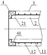 如圖1所示,基于該背景技術(shù),本申請(qǐng)的申請(qǐng)人提出了一種新型的鋼骨架塑料復(fù)合管,其權(quán)利要求1的技術(shù)方案為:一種鋼骨架塑料復(fù)合管,包括經(jīng)線(11)和緯線(12)組合而成的鋼絲網(wǎng)(1),所述鋼絲網(wǎng)(1)的內(nèi)、外兩側(cè)分別設(shè)置有內(nèi)層塑料(2)和外層塑料(3),所述外層塑料(3)的端部與所述鋼絲網(wǎng)(1)的端部平齊,其特征在于,所述內(nèi)層塑料(2)具有突出于所述鋼絲網(wǎng)(1)的端部的突出部(21)。