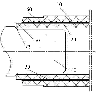 如圖2所示,對(duì)比文件1的具體方案為:包括直管10,設(shè)于直管10內(nèi)的以緯線20和經(jīng)線30組成的鋼網(wǎng)骨架,設(shè)于直管10一端外側(cè)的封位60,位于所述封位60一端的直管10外側(cè)還設(shè)有去除緯線20和經(jīng)線30的臺(tái)階50。
