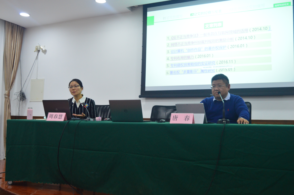 2017年11月12日上午9點(diǎn)半,第三屆“華政·集佳”杯綜述競(jìng)賽系列學(xué)術(shù)活動(dòng)之“知識(shí)產(chǎn)權(quán)論文寫(xiě)作與投稿”專題講座在長(zhǎng)寧校區(qū)交誼樓第三會(huì)議室進(jìn)行。講座主講人為《電子知識(shí)產(chǎn)權(quán)》資深編輯周春慧老師,主持人為華東政法大學(xué)知識(shí)產(chǎn)權(quán)學(xué)院副院長(zhǎng)唐春副教授。講座內(nèi)容分為撰寫(xiě)與投稿兩個(gè)部分。在論文撰寫(xiě)方面,周老師就 “選題”、“文獻(xiàn)查閱、收集、閱讀”、“結(jié)構(gòu)”、“撰寫(xiě)”、“修改”、“成稿”六個(gè)方面進(jìn)行了詳細(xì)的介紹,指出了在相關(guān)撰寫(xiě)過(guò)程中應(yīng)當(dāng)避免的常見(jiàn)錯(cuò)誤,講授了一篇好論文的具體撰寫(xiě)方法。在投稿方面,周老師介紹了知識(shí)產(chǎn)權(quán)領(lǐng)域主要學(xué)術(shù)期刊的基本情況,以及各個(gè)期刊所偏好的論文題材,引導(dǎo)同學(xué)們有的放矢。在最后交流環(huán)節(jié),周老師對(duì)同學(xué)們的問(wèn)題進(jìn)行了答疑解惑,與同學(xué)們進(jìn)行了進(jìn)一步的交流。