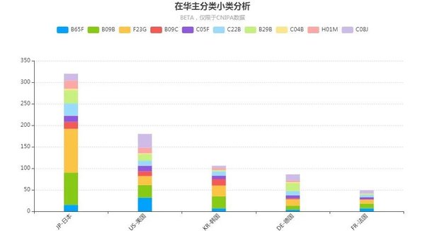 由上文可知,國外申請(qǐng)人在國內(nèi)固廢領(lǐng)域的布局較少,前五個(gè)布局國家各自的技術(shù)布局如圖7所示。由圖可知,除了日本存在兩個(gè)較明顯的優(yōu)勢(shì)小類布局之外,其余幾個(gè)國家的技術(shù)布局雖然各有側(cè)重,但均比較分散。與圖2相比,五個(gè)國外申請(qǐng)主體中只有美國以B65F(家庭的或類似的垃圾的收集或清除,其在分析專利總量中排名第一)為主,部分反映出美國企業(yè)在固廢收集方面的出海優(yōu)勢(shì)。還注意到,日本企業(yè)以F23G(焚化爐;廢物或低品位燃料的焚毀)和B09B(固體廢物的處理)為主進(jìn)行布局,這與日本在垃圾焚燒和處理方面的技術(shù)成熟程度一致。