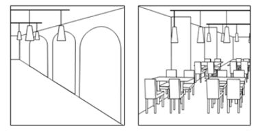 當提交多組圖片/照片,以說明立體商標時,各圖片/照片的細節(jié)需具有對應關系,以說明系同一保護對象。如以下示例1中,左右兩張圖片除了天花板頂部吊燈設計,其他格局和桌椅擺放等,并不能表明為同一場景。因此,僅提交以下兩張圖片無法滿足店鋪裝潢的立體商標申請要求。