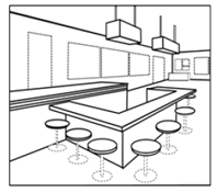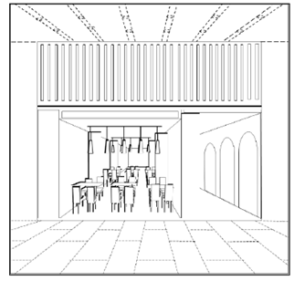如需在一件商標申請中,同時遞交店面外觀和內(nèi)飾裝潢的設計,可繪制在一張圖片里,如以下示例4(分開繪制則將認定為兩份申請)。
