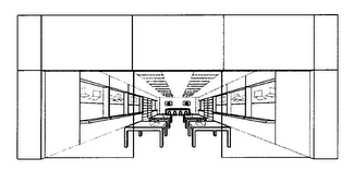 該商標申請所提交的商標描述為:商標由零售商店的設計和布局組成。該商店的特征是一個透明的鑲板外墻玻璃店面,由上方的大型矩形水平面板,兩個較窄的側面面板組成。在商店內(nèi),矩形的嵌入式照明裝置橫穿商店天花板的長度。沿著側壁在凹陷的展示空間下方有懸臂式貨架,在商店中間平行于墻壁,有并成一直線的矩形桌子,從商店的正面延伸到商店的背面。沿著側壁有多層擱板,在商店的后面有一個帶凳子的長方形桌子,下方放置視頻屏幕。墻壁、地板、照明設備和其他固定裝置以虛線顯示,不屬于商標的特征;但是,各種物品的放置被認為是整體標識的一部分。