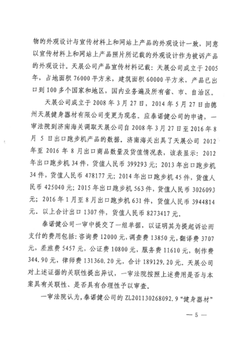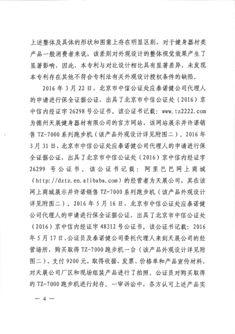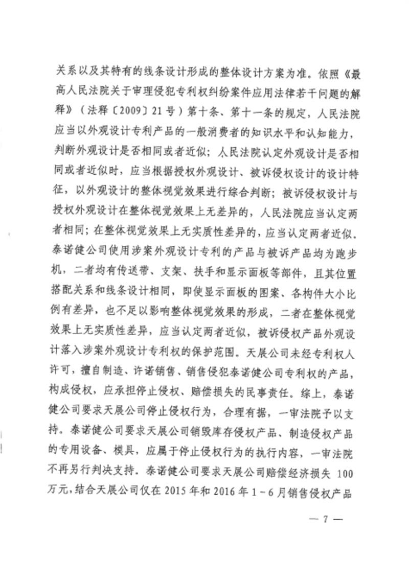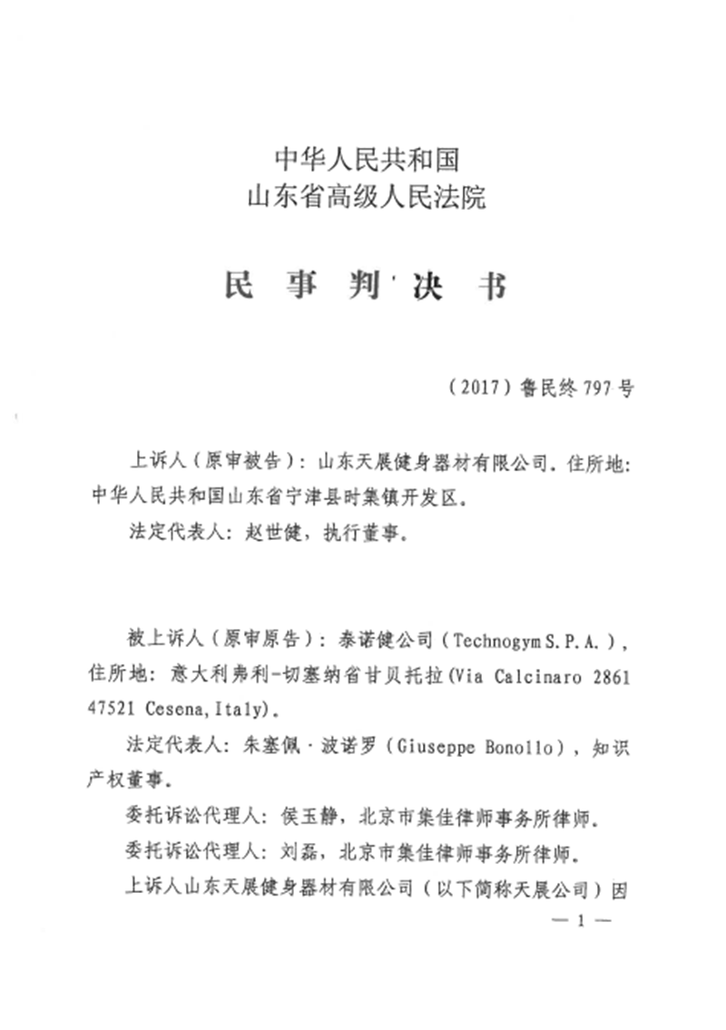 集佳代理意大利泰諾健公司訴山東天展健身器材有限公司(以下簡(jiǎn)稱“天展公司”)侵害外觀設(shè)計(jì)專利權(quán)糾紛一案,經(jīng)濟(jì)南中院一審((2016)魯民初1656號(hào))、山東高院二審((2017)魯民終797號(hào)),我們已于近日收到由山東高院做出的終審判決。山東高院駁回被告上訴,維持一審判決,認(rèn)定被告天展公司生產(chǎn)、銷售、許諾銷售的被控侵權(quán)跑步機(jī)產(chǎn)品落入涉案專利權(quán)保護(hù)范圍,并支持了原告泰諾健公司主張的停止侵權(quán)行為、賠償經(jīng)濟(jì)損失及合理維權(quán)費(fèi)用等請(qǐng)求。