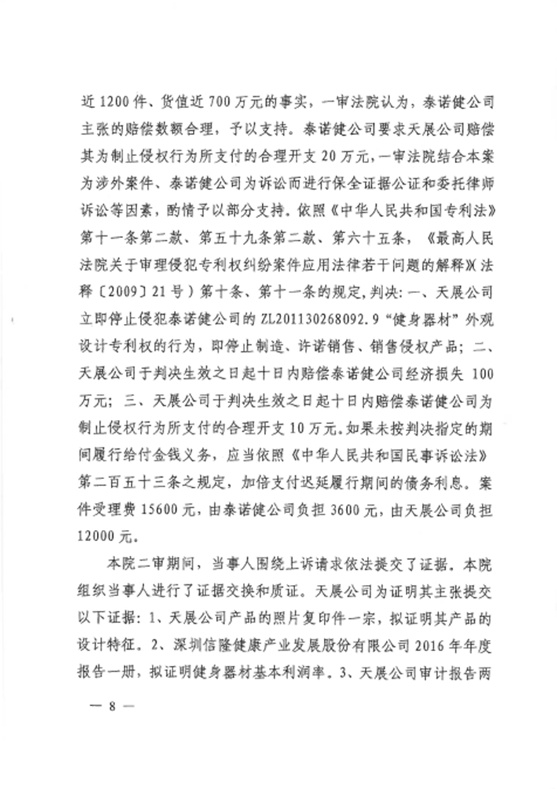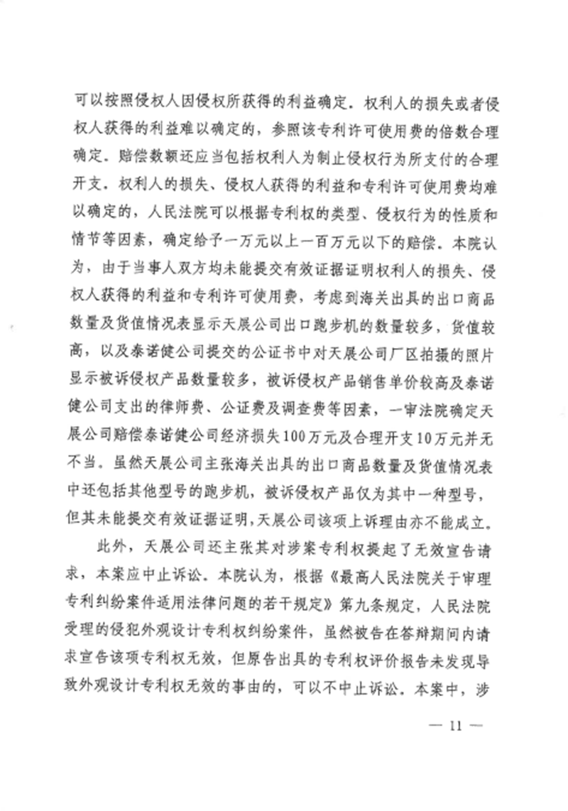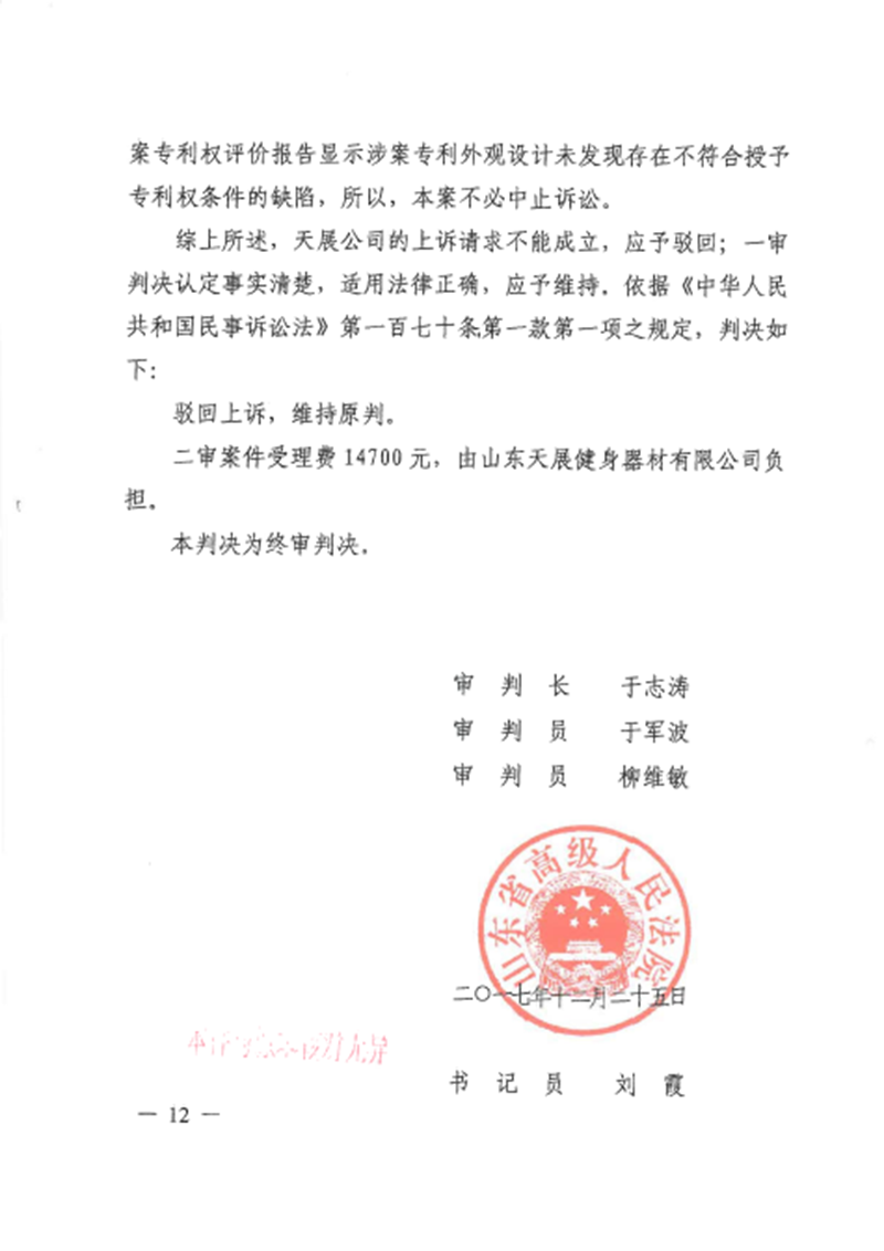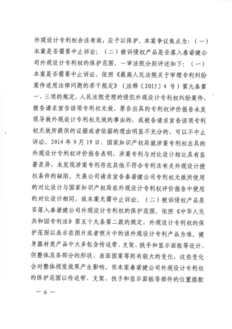 集佳代理意大利泰諾健公司訴山東天展健身器材有限公司(以下簡(jiǎn)稱“天展公司”)侵害外觀設(shè)計(jì)專利權(quán)糾紛一案,經(jīng)濟(jì)南中院一審((2016)魯民初1656號(hào))、山東高院二審((2017)魯民終797號(hào)),我們已于近日收到由山東高院做出的終審判決。山東高院駁回被告上訴,維持一審判決,認(rèn)定被告天展公司生產(chǎn)、銷售、許諾銷售的被控侵權(quán)跑步機(jī)產(chǎn)品落入涉案專利權(quán)保護(hù)范圍,并支持了原告泰諾健公司主張的停止侵權(quán)行為、賠償經(jīng)濟(jì)損失及合理維權(quán)費(fèi)用等請(qǐng)求。
