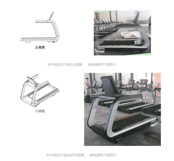 原告經(jīng)調(diào)查發(fā)現(xiàn),被告持有用于制造涉案侵權(quán)產(chǎn)品TZ-7000跑步機的專用設(shè)備、模具,并在其工廠內(nèi)大量制造、組裝、存儲TZ-7000跑步機產(chǎn)品,并通過互聯(lián)網(wǎng)大量銷售及許諾銷售上述侵權(quán)產(chǎn)品。鑒于此,原告泰諾健公司于2016年7月將被告天展公司訴至濟南中院,請求判令被告停止侵權(quán)行為,即停止制造、許諾銷售、銷售侵犯原告外觀設(shè)計專利權(quán)的跑步機產(chǎn)品,并賠償原告實際損失人民幣100萬元及合理維權(quán)費用20萬元。被控侵權(quán)跑步機產(chǎn)品與涉案專利的外觀設(shè)計簡單比對可參見下圖: